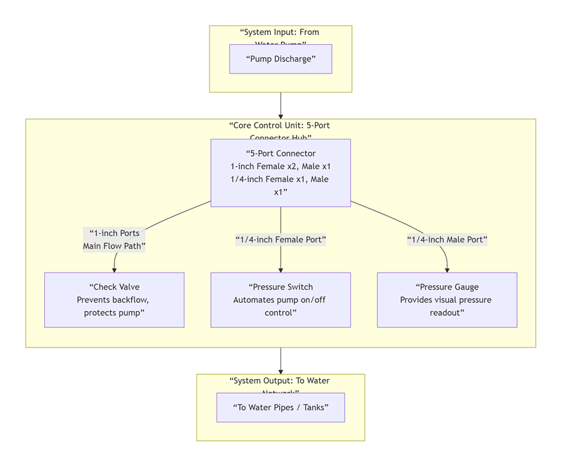 Kernen i den rustfrit stål femvejs konnektor uden kontraventil fremstillet af Joepai Factory er, at selve ventilhuset har fem porte: 1" hun x 1" hun x 1" han x 1/4" hun x 1/4" han. Det er en ren forbindelseskomponent med en intern hul kanal og ingen bevægelige dele, og har ikke til formål at kontrollere ventilen eller reguleringen. distribuere væsker For en lille pumpesystemkontrolenhed fungerer femvejsstikket som en kompakt integreret monteringsplatform, der samler alle vigtige overvågnings- og beskyttelseskomponenter.